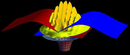 Max-Planck-Institut für Kernphysik - Markus KohlerZwei Teile ein und desselben Elektrons (hier rot und blau) interferieren beim Auftreffen auf ein Atom und senden dabei einen hochfrequenten laserartigen (kohärenten) Lichtblitz aus.