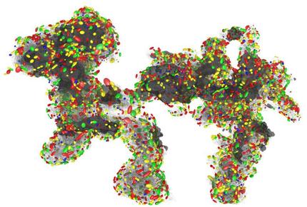 HZBDarstellung der Katalysator-Nanopartikel: Die Partikel (farbig) haften an einem Trägermaterial (grau). Sie werden mit der Elektronentomographie erfasst. Für die Darstellung werden die Daten mit neuen Verarbeitungsalgorithmen bearbeitet.