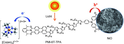 05.12.2012: Die Photovoltaik ist noch immer eine sehr teure Technologie. Eine deutlich kostengünstigere Variante zu den traditionellen Solarzellen könnten Farbstoffsolarzellen sein. Dabei fängt ein Farbstoff statt eines Halbleitermaterials das Licht ein. Besonders vielversprechend scheinen Tandem-Zellen aus einer konventionellen n-Typ- und einer „inversen“ p-Typ-Farbstoffsolarzelle. Eine vielversprechender Ansatz, um die Leistung von photovoltaischen Zellen zu steigern, ist die Kombination einer n- und einer p-Typ-Farbstoffsolarzelle zu einer Tandem-Zelle. Trotz einiger Fortschritte hinken die p-Typen in ihren Leistungsdaten aber immer noch deutlich hinter ihren n-Gegenstücken her. Wissenschaftler von der Monash University und der Commonwealth Scientific and Industrial Research Organization (Australien) sowie der Universität Ulm ist nun eine weitere deutliche Verbesserung der Effizienz von p-Typ-Zellen geglückt, indem sie einen anderen Redoxmediator wählten.