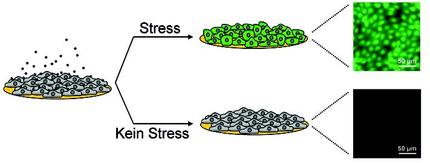 Das Forscherteam ergänzte diese Analysemethode durch einen in den Hautzellen selbst vorhandenen Sensor. Die Keratinozyten wurden vor ihrem Einsatz gentechnisch so verändert, dass sie bei aufkommendem Zellstress im Zellinneren ein fluoreszierendes Protein herstellen. Nach Produktion des Proteins leuchten die Zellen bei Bestrahlung mit blauem Licht grün auf, so dass eine Zellreaktion über das Leuchten der Zellen identifiziert werden konnte. Das neu entwickelte Chipsystem erlaubt es dabei, bis zu drei Substanzen gleichzeitig zu untersuchen und die Zellreaktionen kontinuierlich zu registrieren.