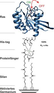 © modifiziert nach JACSAn den Germaniumkristall (grau) hefteten die Bochumer Forscher Sauerstoffatome und erzeugten dadurch sogenanntes „aktiviertes Germanium“. Dieses diente als Andockstelle für Triethoxysilane, an die sich wiederum Proteine mit His-Tag binden lassen – zum Beispiel Ras. Das Schalterprotein Ras kann zwei Zustände – „An“ und „Aus“ – annehmen, die die Forscher mit der Infrarot-Differenz-Spektroskopie im Detail untersuchen konnten.