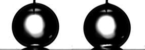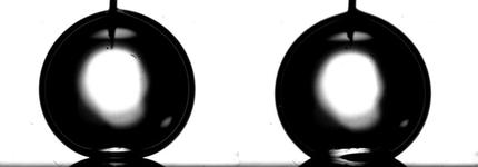 Tropfen auf Mikroelektroden. Bei einer angelegten Spannung von 0 V ergibt sich ein Kontaktwinkel von 166° (links) und bei 6 V ein Kontaktwinkel von 146° (rechts)
