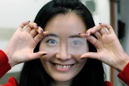 MPI für PolymerforschungMengyuan Li mit zwei dünnen PVDF Proben: rechts, milchige, raue PVDF Folie, die konventionell hergestellt wurde und links: transparente glatte PVDF Folie, die mit verbesserten Verfahren hergestellt wurde.