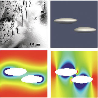 © Ruhr-Universität BochumMechanische und chemische Triebkräfte beeinflussen das Wachstum von Ausscheidungen in einer Nickel-Titan-Formgedächtnislegierung (Experiment oben links). Oben rechts: 3D-Simulation der Ausscheidungen. Unten links: Chemische Triebkräfte (Rot bedeutet eine hohe Triebkraft, Blau eine niedrige) sind in der Nähe der Ausscheidungen reduziert. Unten rechts: Mechanische, genauer gesagt elastische, Kräfte wirken an den äußeren Kanten eines Paares von Ausscheidungen und bewirken eine autokatalytische Keimbildung.