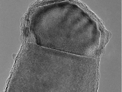 © Nature / MPI für MikrostrukturphysikIn der Wachstumszone eines Nanodrahtes: Ein Aluminiumtropfen nimmt an seiner Oberfläche Silicium auf, das in der Umgebung in Form von Silan enthalten ist. Das Silicium wandert zur Tropfenunterseite, wo es sich schichtweise abscheidet. In dem Siliciumdraht, der sich so bildet, wird dabei deutlich mehr Aluminium eingelagert als theoretisch zu erwarten war. Im Bild eines hochauflösenden Transmissions- Elektronenmikroskops ist die Grenze zwischen Aluminium und Silicium deutlich zu erkennen.