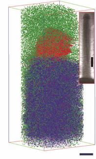 © Nature / Northwestern University IllinoisIm Atomsonden-Tomografen offenbart sich die atomare Struktur des Materials: Rot sind die repräsentativen Positionen der Aluminiumatome dargestellt und blau diejenigen der Siliciumatome. Eine Analyse der Daten zeigt die sehr hohe Konzentration von Aluminium im Silicium und seine gleichmäßige Verteilung. Aus experimentellen Gründen wurde der Nanodraht für die Untersuchung mit einer Nickelschicht (grün) überzogen.