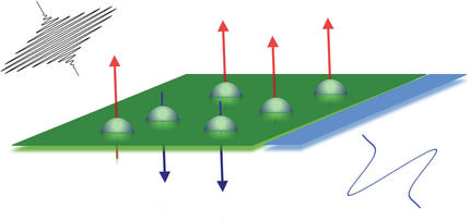 Forschungszentrum JülichLaserpulse führen einem magnetischen Eisenfilm (grün) Energie zu. Dies erzeugt Spinstrompulse in der zweiten, nichtmagnetischen Schicht des Systems (blau), weil Elektronenspins in Abhängigkeit von ihrer Orientierung (orange Pfeile: „Up“, blaue Pfeile: „Down“) unterschiedlich häufig in diese Schicht übertreten.