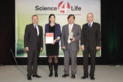 Science4LifeSteffen Saebisch, Staatssekretär im Hessischen Wirtschaftsministerium, Nina Kloster und Damian Hintemann von Ruhr Compounds und Dr. Karl-Heinz Baringhaus von Sanofi (v.l.n.r.), bei der Konzeptprämierung des S4L Venture Cups 2013