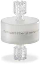 Sartobind Phenyl bietet die Vorzüge eines Adsorbers mit HIC-Ligand, während er in Spezifität und Verhalten einer konventionellen HIC-Matrix entspricht. Der hydrophobe Phenylligand ist kovalent an die >3µm Cellulosemembran gekoppelt. Die Bindung von Zielmolekülen an die Membran erfolgt mit vergleichbarer Bindekapazität und bei etwa gleichen Pufferbedingungen, wie sie für konventionelle HIC-Säulen angewendet werden. Die Flussrate kann jedoch mindestens 10fach höher gewählt werden. Die Auflösung ist mindestens ebenso gut wie bei vergleichbaren Phenylsäulen.