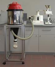 Die effiziente Luftführung in der PULVERISETTE 14 und der starke Luftwirbel innerhalb des FRITSCH-Zyklons kühlt die Probe während der Mahlung, verringert die Erwärmung des Mahlgutes und damit ein Zusetzen/Verstopfen des Siebringes. Gleichzeitig erhöht dies den Durchsatz erheblich. Auch wird der Reinigungsaufwand in der Mühle selbst auf ein Minimum reduziert. Der Luftstrom innerhalb des FRITSCH-Zyklons leitet die gemahlene Probe direkt in das aufgeschraubt Probenglas. Diese Art des Probenaustrags bietet den größten Komfort, da das Mahlgut direkt in eine Glasflasche gesaugt wird, in der es transportiert, gelagert oder leicht für eine Analyse entnommen werden kann. Dabei wird der Feinststaub durch den HEPA-Feinststaubfilter im Zyklon zurückgehalten.