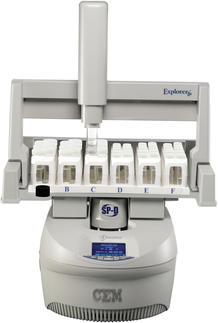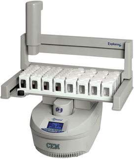 Dort wird die Probe dann individuell aufgeschlossen, in 2 min. auf Raumtemperatur abgekühlt und vom Autosampler wieder zurück ins Rack gebracht. Nun ist die nächste Probe dran. Auf das Discover SP-D können 3 unterschiedliche Autosampler (Modell Explorer) aufgesetzt werden: Ein Autosampler fasst 48 Proben, ein weiterer Probengeber fasst 72 Proben und der größte Autosampler kann bis zu 96 Proben am Tag und über Nacht abarbeiten.