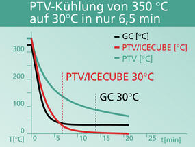 Bei gleichzeitiger Kühlung von GC-Ofen und PTV kann der PTV innerhalb von 6,5 min von 350 °C auf 30 °C gekühlt werden, der Ofen benötigt 14 min. Nach 14 min, wenn der GC-Ofen eine Temperatur von 30 °C erreicht hat, ist der PTV ist auf 0 °C gekühlt (s. Grafik).