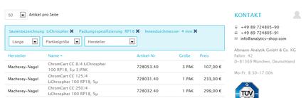 Ohne sich zuerst registrieren zu müssen können sie aus über 50.000 analytischen, präparativen und U(H)PLC Säulen wählen. Stellen Sie einfach die Preise der Säulen von renommierten Originalherstellern mit Refill-HPLC Säulen gegenüber. Das Anfragen von Angeboten verschiedener Anbieter erübrigt sich dadurch. Im analytics-shop.com sind die HPLC Säulen sofort bestellbar und werden in der Regel in 3-4 Werktagen versandkostenfrei geliefert. Und sollten Sie nicht fündig werden können Sie das HPLC Säulen Team anrufen. Probieren Sie es!