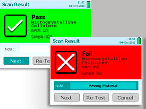 Sowohl Identitätsprüfung von Rohmaterialien als auch von Fertigprodukten ist aufgrund der hervorragenden Selektivität der Ramanspektroskopie möglich. Klassischer Einsatz der Geräte ist auch die Echtheitsprüfung von Arzneimitteln (counterfeit – Testing).