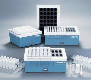 Heizblocksysteme werden zum Aufschluss einfacher Proben wie z.B. Umweltproben (Abfall, Böden, Schlamm, Abwasser …) verwendet. Um Kontaminationen auszuschließen verbleiben die Proben von der Einwaage bis zur spektroskopischen Analyse immer im gleichen Gefäß. Für spurenanalytische Untersuchungen ist die Reinheit der Aufschlussgefäße somit essentiell.