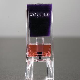 Für die Durchführung der Messungen kann man neben der 1 µL Quarzglasküvette auch Einwegküvetten einsetzen. Verfügt man über ausreichend Probe, so bietet sich die Verwendung von 50µL Eppendorf UVetten an. Für Messungen mit Einwegküvetten bei kleinsten Probevolumina gibt es die neuen 4 µL Einwegküvetten von Wyatt Technology. Diese wurden speziell für den Einsatz im NanoStar entwickelt. Eine solche Küvette ist in Abbildung 2 gezeigt. Die dunkle Flüssigkeit in der Mitte Küvette stellt Probelösung dar. Sie ist, getrennt durch eine Einfassung, umgeben von Lösungsmittel (braune Flüssigkeit). Diese Anordnung hält die Verdunstung von Lösemittel aus der eigentlichen Probe so gering wie möglich. Zudem kann man ohne die Zugabe von Lösemittel die Probe mit Paraffinöl überschichten, was den gleichen Effekt erzielt.