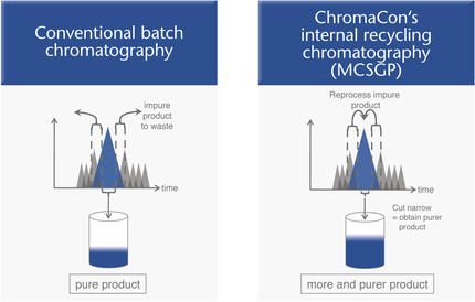 Ein MCSGP-Prozess arbeitet mit zwei statt einer Trennsäule. Durch kontinuierliche Säulenschaltung werden Nachbarfraktionen, die auch Teile des Zielproduktes enthalten, intern recycelt und die Effizienz dadurch maximiert. So können Reinheit und Ausbeute um bis zu 50%, der Umsatz um das 10-fache gegenüber Batch-LC gesteigert werden, bei gleichzeitiger Senkung des Lösungsmittelverbrauchs um bis zu 70%.
