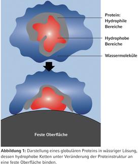 Bei Kontakt mit festen Oberflächen kann sich die drei-dimensionale Struktur der Proteine so verändern, dass die hydrophoben Regionen nach außen treten und mit den hydrophoben Bereichen der Kunsstoff-Oberfläche in Kontakt treten (Abbildung 1).