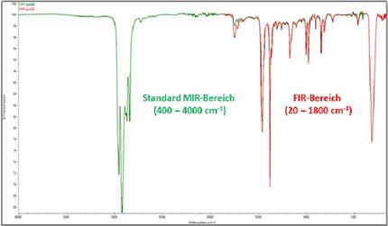 ATR-Spektrum einer gefüllten PP-Folie. Grün: Standard MIR-Bereich zur Identifikation der PP-Matrix. Rot: Patentierter SolidSubstrate-Strahlteiler für den FIR/MIR Bereich zur Identifikation von PP und anorganischem Füllmaterial.
