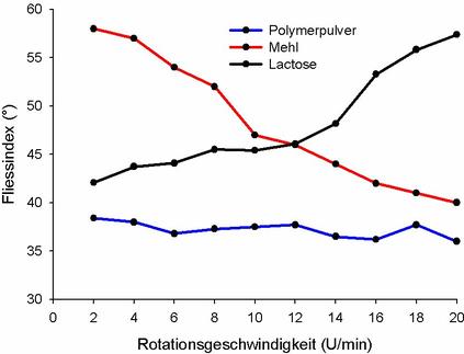 Fließverhalten, aufgezeichnet als Funktion der Rotationsgeschwindigkeit von Polymerpulver, Mehl und Lactose