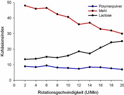 Kohäsionsindex, aufgezeichnet als Funktion der Rotationsgeschwindigkeit von Polymerpulver, Mehl und Lactose