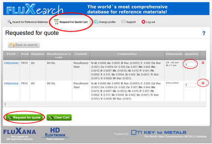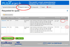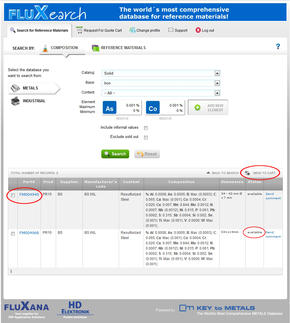 Sie haben mehrere Suchmöglichkeiten: nach Elementkonzentrationen, Namen, Code oder einem Produzenten. Sobald Sie die gewünschten Proben gefunden haben, können Sie sie in einem Warenkorb zwischenspeichern und die Suche fortsetzen. Am Ende Ihrer Suche können Sie alle gespeicherten Proben als Anfrage zu FLUXANA senden und erhalten umgehend ein Angebot entweder noch am gleichen oder nächsten Arbeitstag.