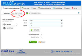 Suche nach Elementkonzentrationen über SEARCH BY COMPOSITION, wobei Sie die Möglichkeit haben nach METALS und INDUSTRIALS zu suchen.