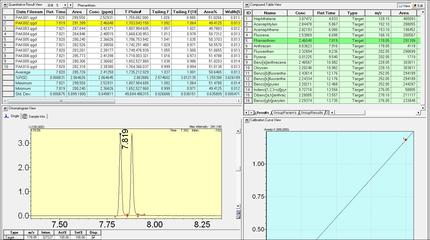 Abb. 2: Auswertung von 10 Einzelmessungen eines PAK-Standards mit dem GCMS Browser. Auf einen Blick ist die Integration und Identifizierung der Zielkomponente zu erkennen, die Konzentration und Reproduzierbarkeit abzulesen und auch die Kalibration zu überprüfen.