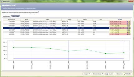 Modul Messwerterfassung: Der Werteverlauf zeigt in übersichtlicher und schnell aufzurufender Darstellung die Messergebnisse eines Merkmals zu einer Reihe von Proben und über den entsprechenden Zeitraum.