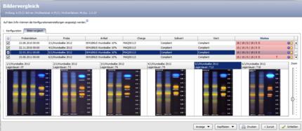 Bildvergleich: Ähnlich dem Werteverlauf werden hier Bilddaten, die zu einem selektierten Merkmal abgelegt wurden, im Zeitverlauf (z.B. der Dünnschichtchromatographien zu den Zeitpunkten einer Stabilitätseinlagerung) dargestellt.