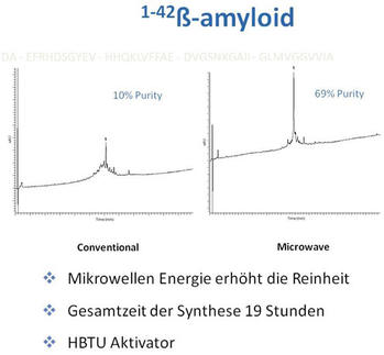 In der Regel sind jedoch auch ohne aufwendige Optimierungen mit den Standardprotokollen sehr gute Ergebnisse realisierbar. Ein gutes Beispiel für ein „schwieriges Peptid“ stellt das β-Amyloid dar, welches ein aus der Alzheimer Forschung bekanntes 42mer darstellt. Unter konventionellen Bedingungen wird das Peptid in einer Reinheit von nur 10% gewonnen, während mit dem Liberty und Verwendung von Standardprotokollen (d.h. ohne Optimierung) bereits eine Rohprodukt-Reinheit von 69% erreicht wird.
