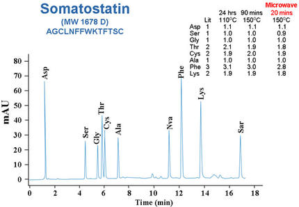 Die Protein-Hydrolyse ist eine altbewährte Aufschlussprozedur aus den Fünfziger Jahren zur Analyse der Aminosäurezusammensetzung von Peptiden und Proteinen. Mittels einer Aminosäuren-Analyse (AAA) des Hydrolysates erfolgt die Quantifizierung der einzelnen Aminosäuren der jeweiligen Probe – eine Methode die mittlerweile neben der Sequenzierung mittels MS/MS zum Standard bei der Analytik von Peptiden und Proteinen zählt. Auch hier liefert der Einsatz der Mikrowellentechnik enorme Vorteile: