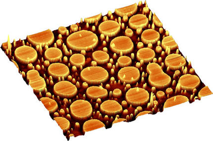 Eine sehr interessante Topographie (Abb. 3) zeigt zum Beispiel ein 2 Komponenten-Polymergemisch aus Polymethylmetacrylat (PMMA) und Styrolbutadienrubber (SBR). Es sind inselartige ca. 20 – 30 nm hohe Strukturen erkennbar, deren Durchmesser zwischen 150 nm und 4 µm liegen. Eine genaue Zuordnung der beiden Polymere zu den im AFM beobachteten Strukturen ist jedoch nur schwierig möglich.
