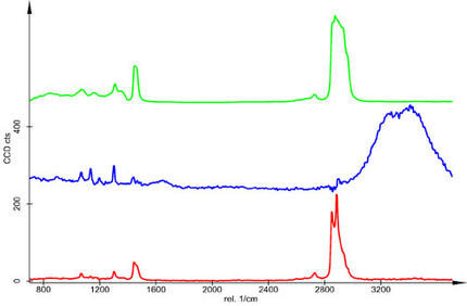Abb. 1 b) Korrespondierende Spektren (entmischt); Grün: Öl; Rot: Alkan; Blau: Wasser