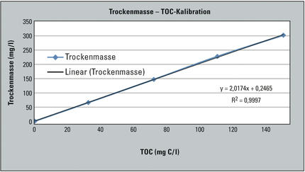 Mit dem Differenzverfahren werden TC und TIC bestimmt und daraus der TOC errechnet. Durch eine Kalibration mit der erhaltenen Trockenmasse der Algen kann man dann vom TOC auf den Biotrockenmassenanteil in der Probe zurückschließen (Abbildung 2).