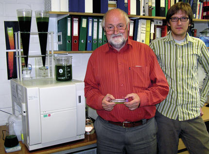 Der Student Sascha Hendes (Foto, mit Hilmar Franke zusammen bei der Algenmessung) hatte die Idee, die Algenbiomasse über den TOC zu bestimmen. Das fand auch bei den Mitarbeitern von Shimadzu Anklang, da es eine interessante und ungewöhnliche Verwendung des TOC-Geräts ist.