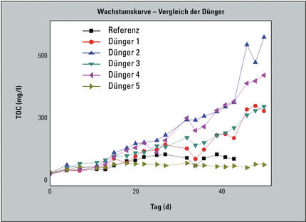 Um die Anwendbarkeit bei der Spezifizierung des Algenwachstums zu veranschaulichen, wurde vom Student Dominik Gerhard in seiner Diplomarbeit das Wachstum von Algen in unterschiedlichen Nährmedien unter anderem mit dem TOC untersucht (Abbildung 3). Als spezielle Maßnahmen zur Reinigung des TOC bei dauerhafter Messung von Algen sollten am Ende eines jeden Messtags die Spritze und die Probenschleifen gründlich mit verdünnter Salzsäure gespült werden, um einen Bewuchs durch Algen zu vermeiden. Besonders vor Wochenenden ist dies wichtig, da man sonst danach bei den Messungen erhöhte Messergebnisse durch den Bewuchs der Algen beobachten kann.