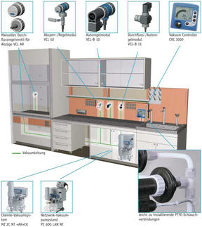 ln modernen chemischen oder pharmazeutischen Laborgebäuden gehört Vakuum heute genauso zur Grundausstattung für die Laborarbeitsplätze wie beispielsweise Reinstgase. Folgerichtig wird bereits bei der Planung von neuen Laboratorien die Vakuumversorgung voll integriert. Schließlich wird Vakuum für viele verschiedene Anwendungen benötigt - seien es Eindampfungen, Destillationen, Trocknungen im Vakuumtrockenschrank, oder auch Absaugungen und Filtrationen. Diese Anwendungen lassen sich sehr gut mit Chemie-Membranpumpen abdecken.
