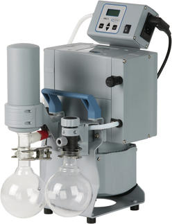 Dieses Chemie-Vakuumsystem findet ein breites Anwendungsgebiet zum Evakuieren, Eindampfen und Abpumpen von Gasen und Dämpfen in chemischen, biologischen und pharmazeutischen Laboren, bei denen keine druckseitige Kondensation der Lösemitteldämpfe erforderlich ist. Der saugseitige Abscheider (AK) aus Glas mit Schutzbeschichtung hält Partikel und Flüssigkeitströpfchen zurück. Der druckseitige Abscheider sammelt Kondensat, vermeidet Kondensatrücklauf in die Pumpe, dämpft die Auspuffgeräusche und macht die Pumpe dadurch flüsterleise.