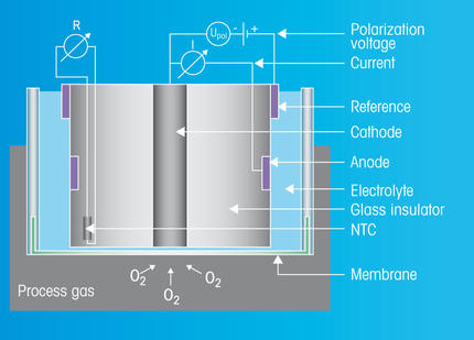 Gemessen wird der Sensorstrom, der zwischen Anode und Kathode fließt und sich proportional zur Sauerstoffkonzentration im Prozess verhält. Dabei wird die Anordnung der Kathode und Anode so gewählt, dass ein Sensorstrom erzeugt wird. Die Polarisationsspannung, die erforderlich ist um einen stabilen und linearen Bezug zwischen Sauerstoffpartialdruck und Sensorstrom herzustellen, wird zwischen der Silber/Silberchlorid-Referenzelektrode und Platinkathode angelegt. Die Elektrodenkonstruktion aus Anode, Kathode, Referenz und Elektrolyt ist durch die Membran hermetisch vom Prozess abgeriegelt. Die Membran ist semi-permeabel für Gase oder flüchtige Substanzen, aber nicht für Ionen und schädliche Oxidations- und Reduktionsmitteln, die die Sauerstoffmessung beeinflussen können. Zusätzlich ist in der Membran ein Stahlnetz integriert, um die Druckfestigkeit zu erhöhen. Die Außenfläche der Membran ist mit schmutzabweisendem Teflon (PTFE) beschichtet, damit der Sensor anspruchsvollen Prozessbedinungen standhält, inklusive Feuchtigkeit und Staub.