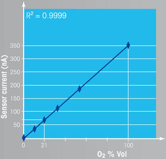 Abbildung 4 stellt den Zusammenhang dar zwischen Sensorstrom und O2-Konzentration, der zu fast 100 % linear über den gesamten Messbereich ist. Dieser Sachverhalt demonstriert zwei wesentliche Merkmale polarographischer Sensoren: