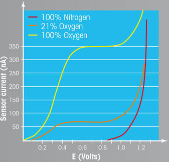 Wenn die Polarisationsspannung über Null auf 1,5 V hinausschießt, würde der daraus resultierende Sensorstrom einen S-Kurvenverlauf im Polarogramm aufzeigen. Das Polarogramm sollte immer einen flach verlaufenden Bereich in der Mitte aufzeigen, sodass kleine Änderungen in der Polarisationsspannung keinen Einfluss auf den resultierenden Sensorstrom haben. Aus diesem Grund wird eine Polarisationsspannung gewählt, die im mittleren Bereich liegt. Die flachen Verläufe resultieren aus dem Stromwert, der durch die Sauerstoffdiffusion an der semi-permeablen Membran entsteht und durch die Polarisationsspannung begrenzt ist. Dieser Effekt ist entscheidend für die Linearität des Messsignals. Die Polarisationsspannung für polarographische Sensoren liegt im Bereich von -500 bis -700 mV.