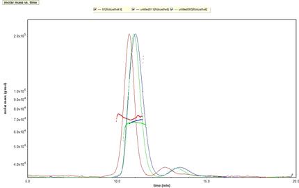 Abbildung 5 zeigt das resultierende Fraktogramm mit den RI-Signalen und den Molmassen, die mit dem MALS-Detektor bestimmt wurden. Obwohl keine vollständige Basislinientrennung erfolgte, wurde bei den Molmassen eine hohe Genauigkeit erzielt. Gegenüber bisher publizierten Daten [7] zeigt sich eine signifikante Verbesserung der Trennleistung bei guter Reproduzierbarkeit (Daten nicht gezeigt).