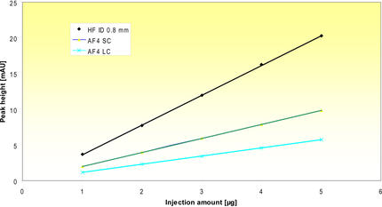Die Ergebnisse bestätigen die geringe Probenverdünnung, wodurch eine hohe Nachweisempfindlichkeit ermöglicht wird (Abb. 4). Gezeigt ist die Höhe des UV-Signals als Funktion der Aufgabemenge des Enzymproteins Carboanhydrase (CAH) im Vergleich zwischen HF5 und zwei verschiedenen AF4 Kanälen, SC und LC. Die Kanalhöhe ist vergleichbar (HF5 Radius 400 µm, Kanalhöhe der AF4 Kanäle 350 µm). Aufgrund des geringen Kanalvolumens sind die Peaks nach der HF5 Trennung um den Faktor 4 bzw. 6 höher.