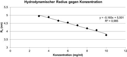 Misst man den hydrodynamischen Radius der reinen Antikörperverdünnungsreihe, so kann man für jede Konzentration die jeweilige Viskosität einsetzen und erhält so die Werte für den hydrodynamischen Radius (Abbildung 5).