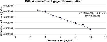 Aus der Steigung (‑2.39*10-8 m2/s) ergibt sich eine Dissoziationskonstante kD von (‑0.35 mL/g). Aus dieser lässt sich nach Lehermayer et al. aus folgender Formel der zweite Virialkoeffizient A2 bestimmen: