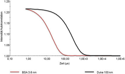 Abbildung 3: Autokorrelationsfunktion von BSA (Radius =3.6 nm) und Polystyrol Nanosphere Größenstandard 100 (Radius 50 nm).