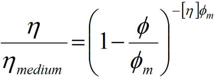 In dieser Gleichung bedeutet η die Viskosität der Suspension, η Medium die Viskosität des Lösemittels, φ der Volumengehalt der Feststoffe in der Suspension, φm der maximale Feststoffvolumengehalt in der Suspension, [η] die intrinsische Viskosität des Lösemittels, d.h. 2,5 für kugelförmige Körper.