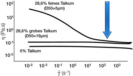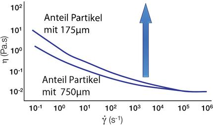 Eine höhere Partikelgröße führt zu einer geringeren Anzahl von Partikel-Partikel-Wechselwirkungen. Dieser Effekt ist aufgrund der geringen Kräfte der Partikel-Partikel-Wechselwirkungen bei niedrigen Scherraten am stärksten ausgeprägt.