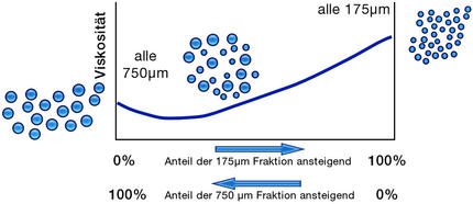 Unter Beibehaltung der Volumenanteils der dispersen Phase hat eine Probe mit relativ großen Partikeln und einem kleinen Anteil kleiner Partikel eine geringere Viskosität als die Probe mit nur kleinen Teilchen oder nur großen Partikeln alleine.